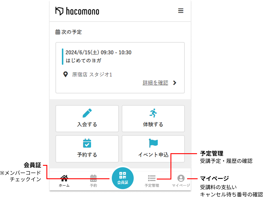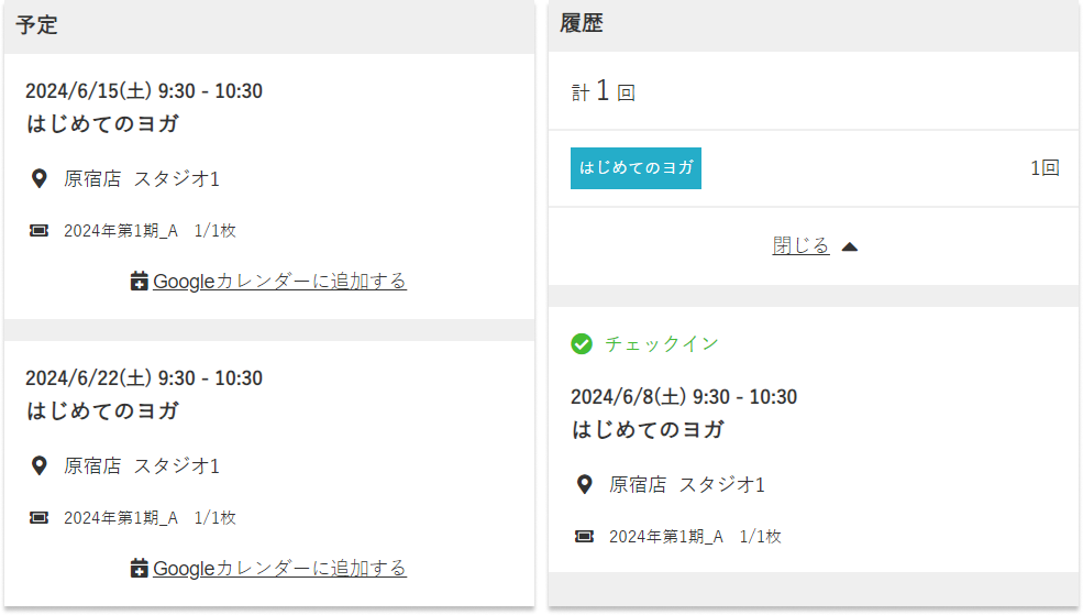 受講予定のレッスンは[予定]の一覧に、チェックイン済みのレッスンは[履歴]の一覧に表示されます。
