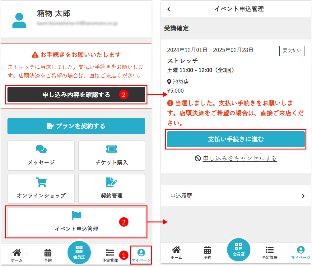 - 画面下部の[マイページ]>[イベント申込管理]をタップし、イベント申込管理画面で[支払い手続きに進む]をタップします。