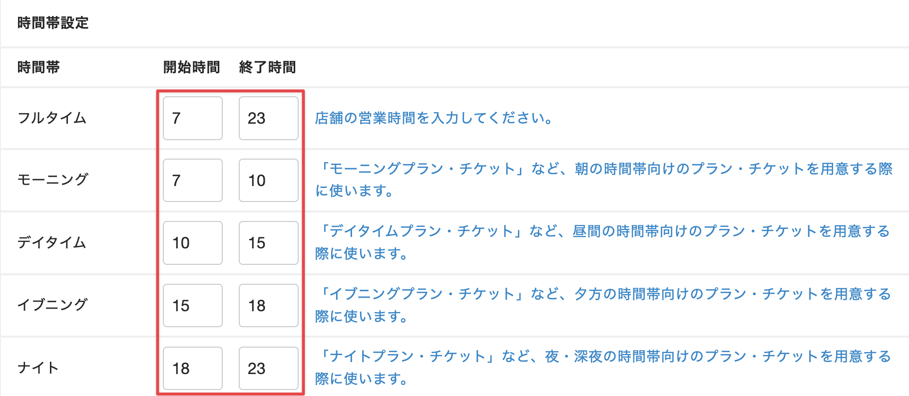 プランマスタの時間帯ごとの時間は、店舗マスタの[時間帯設定]に設定されます。例えば、[フルタイム]のプランを契約している場合、下記の設定では7:00〜23:00に入館できます。