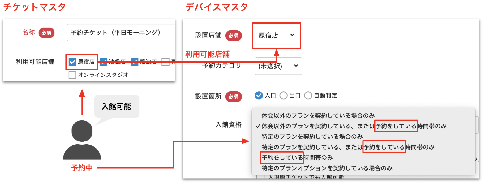 [入館資格]の判定条件が、「予約をしている時間帯」の場合:予約チケットのチケットマスタの[利用可能店舗]に、デバイスマスタの[設置店舗]の店舗が含まれていれば入館可能です。
