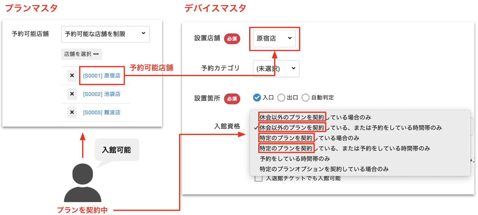 [入館資格]の判定条件が「プラン契約」(休会以外)の場合:契約プランのプランマスタの[予約可能店舗]に、デバイスマスタの[設置店舗]の店舗が含まれていれば入館可能です。