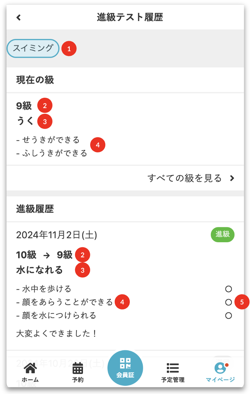 進級種目マスタに設定した内容は、進級テストの結果などを確認できるメンバーサイトの進級テスト履歴画面に表示されます。