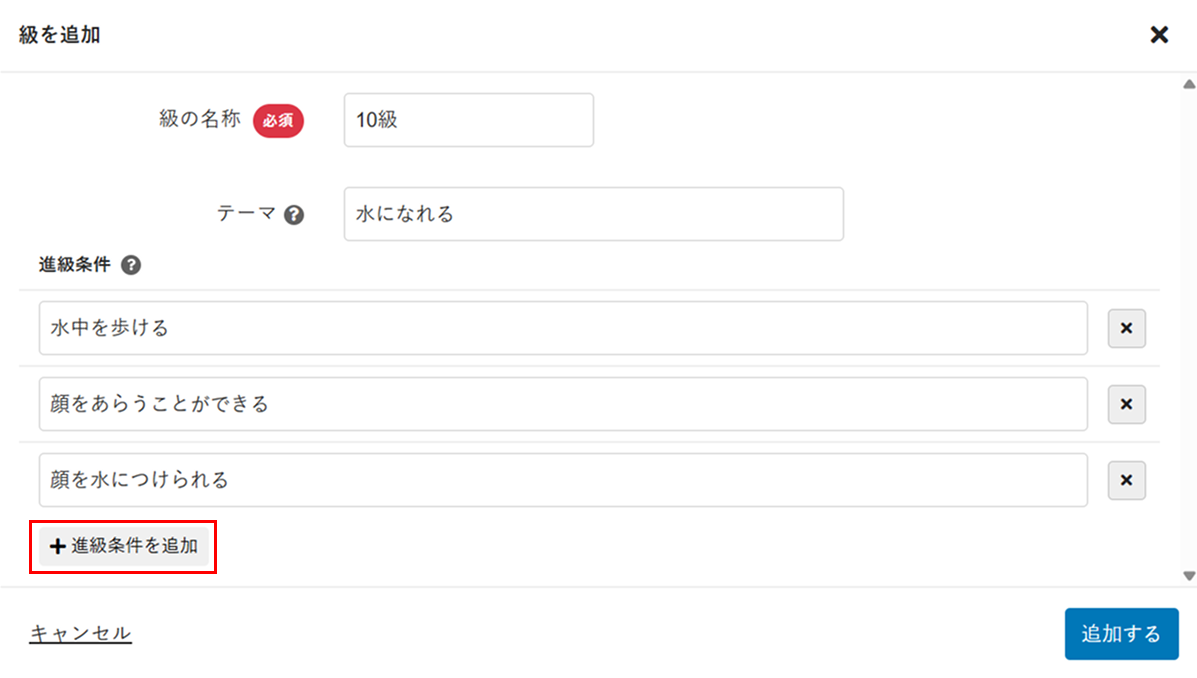 [進級条件を追加]をクリックし、[進級条件]に進級条件を入力します(例:「水中を歩ける」、「顔をあらうことができる」)。