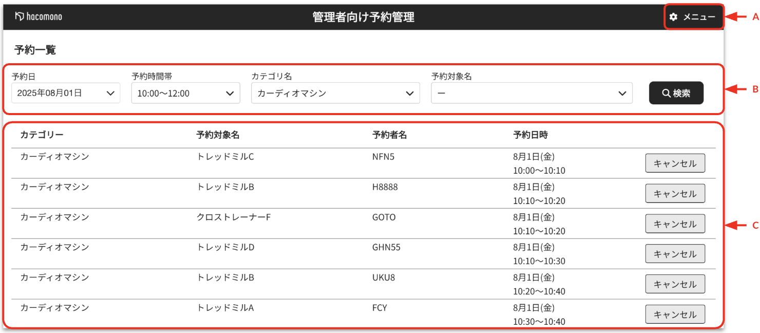 | C. 予約一覧 | 予約一覧が表示されます。 予約の終了時刻まで[キャンセル]ボタンが表示され、キャンセルできます。 |
