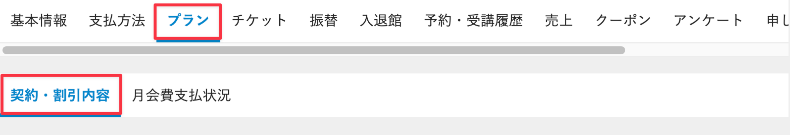 - メンバー詳細画面で[プラン]>[契約・割引内容]タブを選択します。