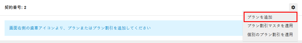新しい契約番号の枠が追加されます。 - 歯車アイコンをクリックし、[プランを追加]を選択します。