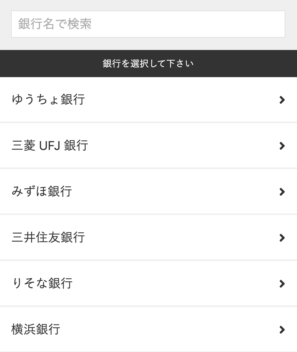 金融機関によって、支店名、支店番号、口座番号、キャッシュカードの暗証番号、インターネットバンキングのパスワード、ワンタイムパスワード(アプリ、カード、生成機など)などが必要になります。注意:これ以降は中断せずに登録完了画面が表示されるまで手順を進められるようにご準備ください。途中でブラウザ画面を閉じたり長時間ブラウザ画面を放置すると登録失敗と見なされます。 - 表示された銀行の一覧から、登録する口座のある銀行を選択します。検索のテキストボックスで銀行名を入力して、一覧に検索結果を表示することもできます。