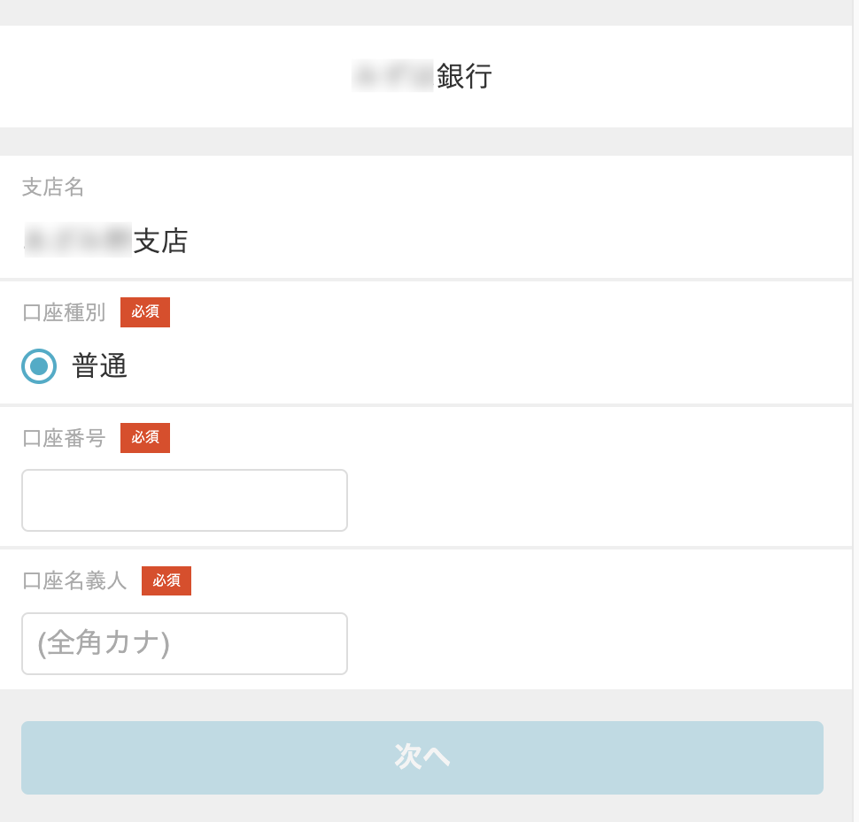 - 表示された画面で、口座種別、口座番号、口座名義人など必要な情報を入力して、[次へ]をタップします。