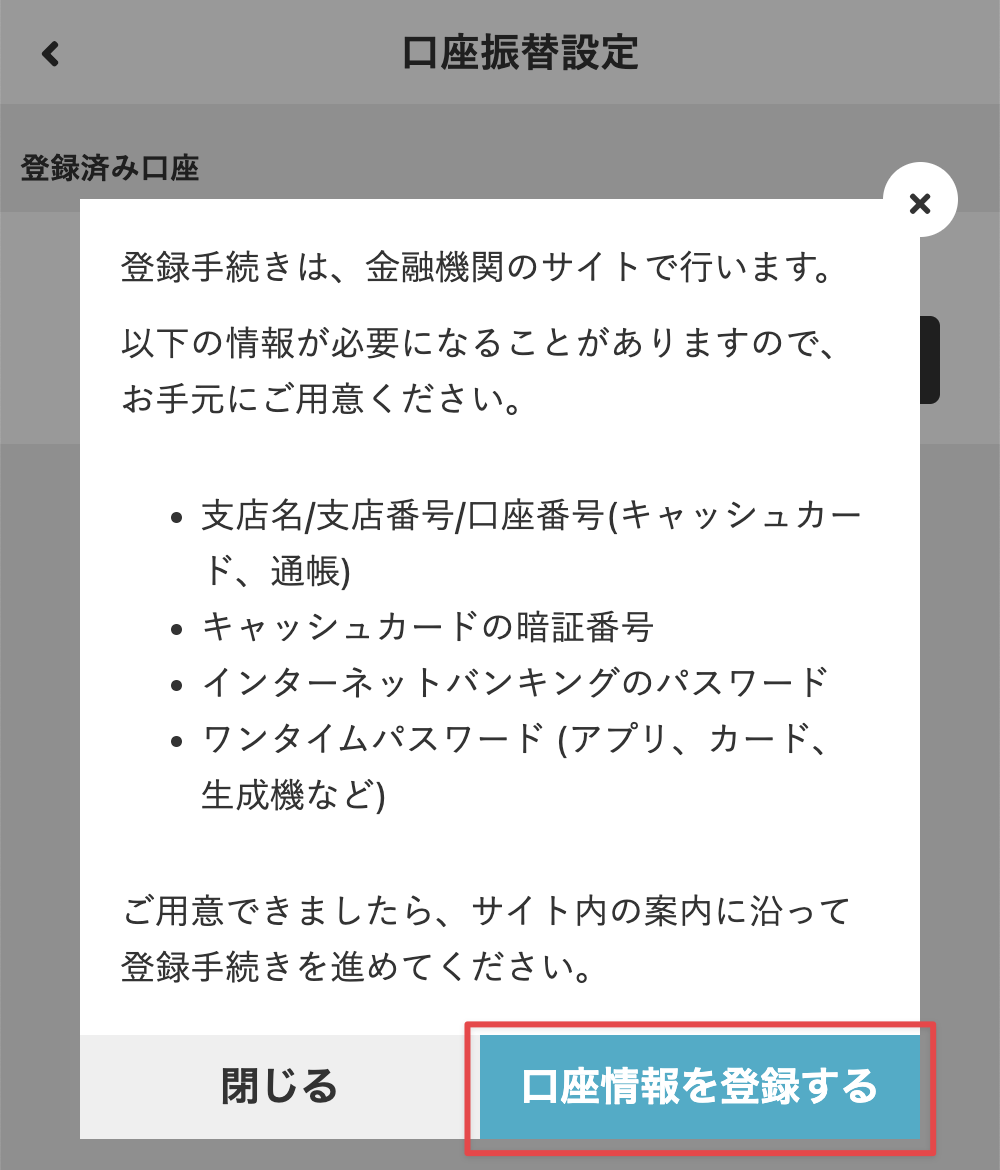 - 登録手続きに必要な情報を準備して、[口座情報を登録する]をタップします。