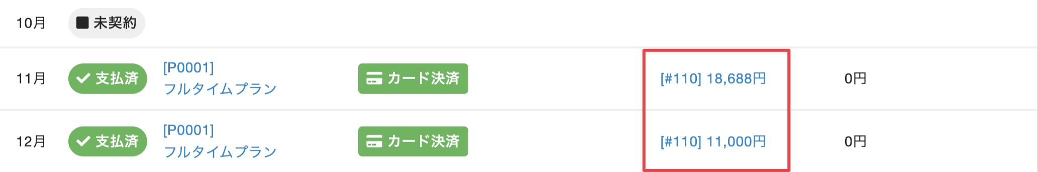 メンバーサイトからのプランの新規契約時、日割りの初月月会費と2ヶ月目の月会費、入会金その他が、同じ売上IDで一度に決済されます。