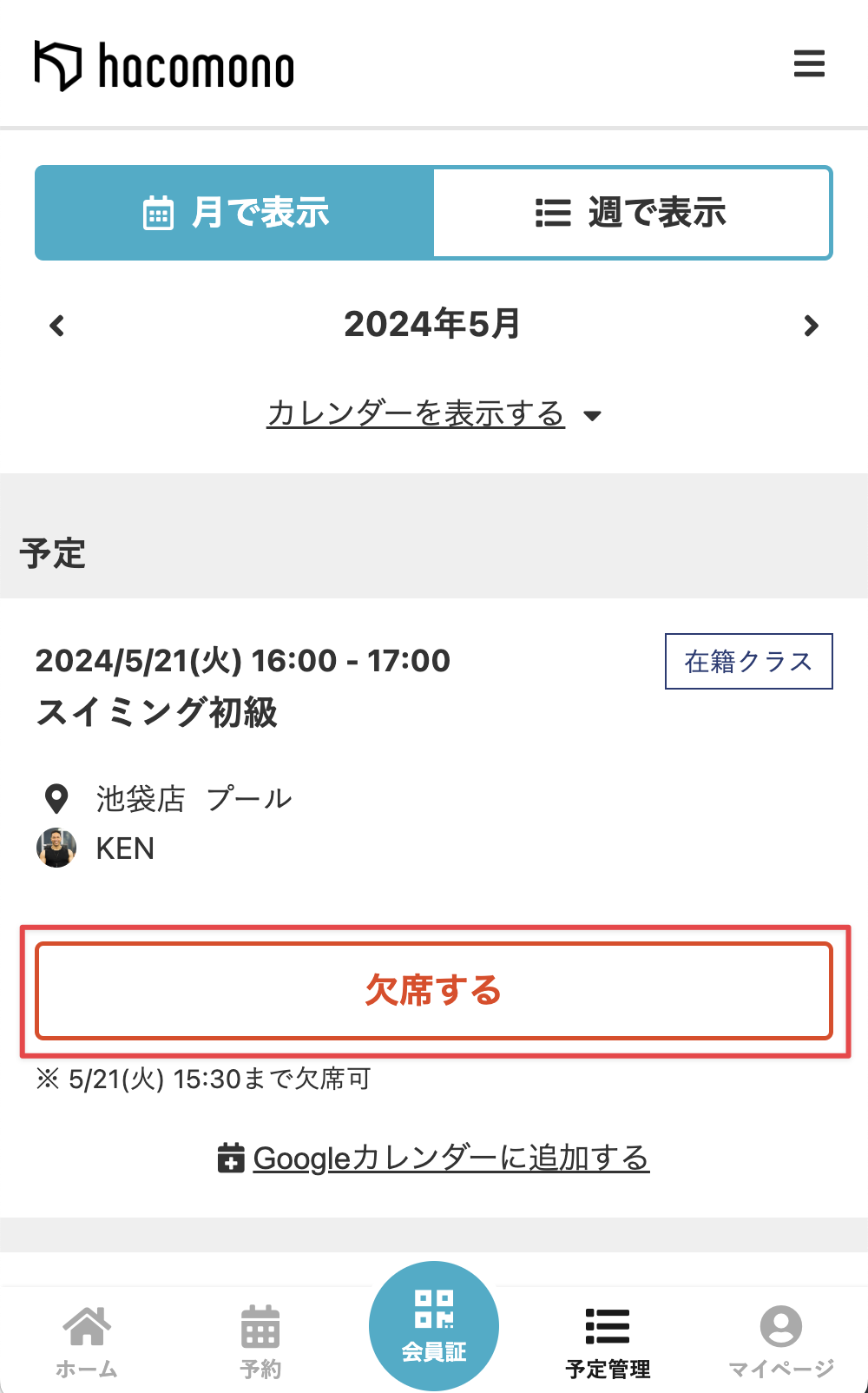スクールのレッスンは、固定枠予約(「固定枠予約とは」を参照)と同じカレンダーに、設定された開催曜日・時間で繰り返し自動生成されます。各種の手続きは、固定枠予約とほとんど同じ手順で行うことができます。