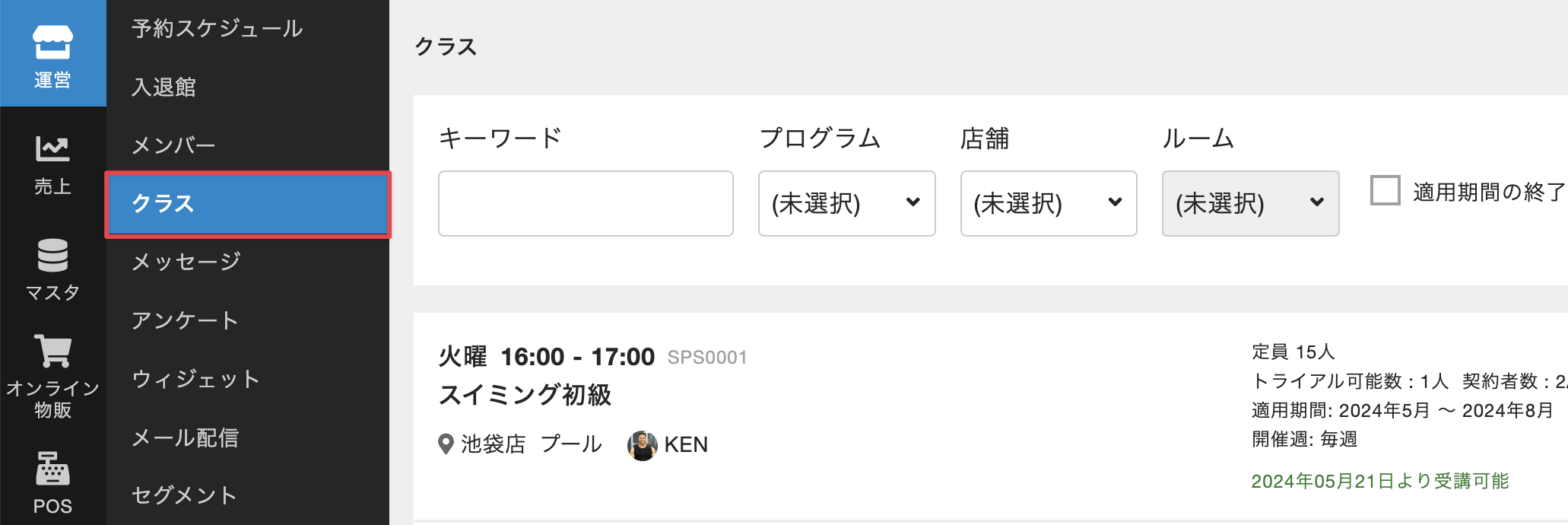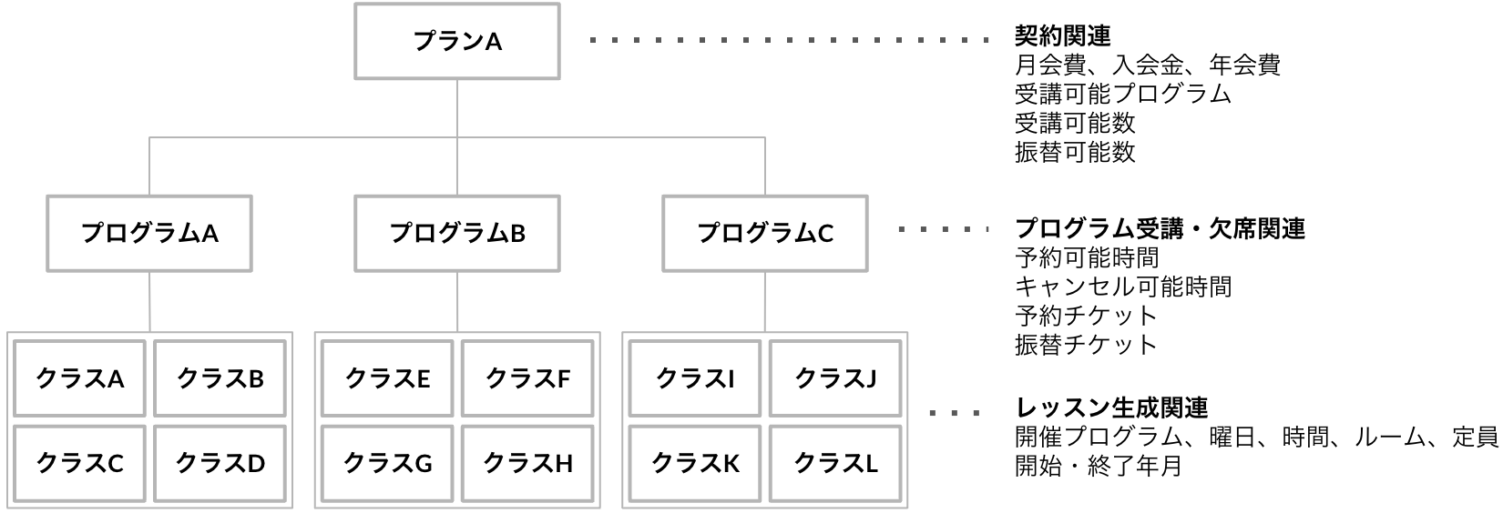 スクールは、プランマスタ、プログラムマスタ、クラスを設定することで、レッスン予定や契約メンバーの受講予定が自動生成されます。それぞれに設定する主な情報は以下のとおりです。