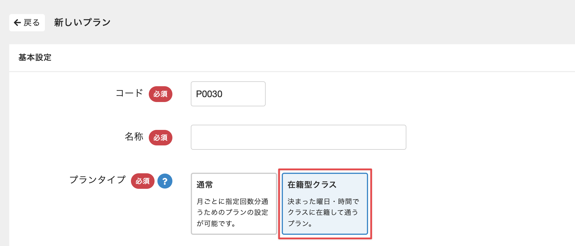 プランマスタの[プランタイプ]に[在籍型クラス]が追加