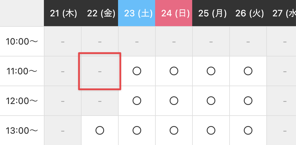 予約がブロックされている予約枠は、メンバーサイトで以下の表示になります。