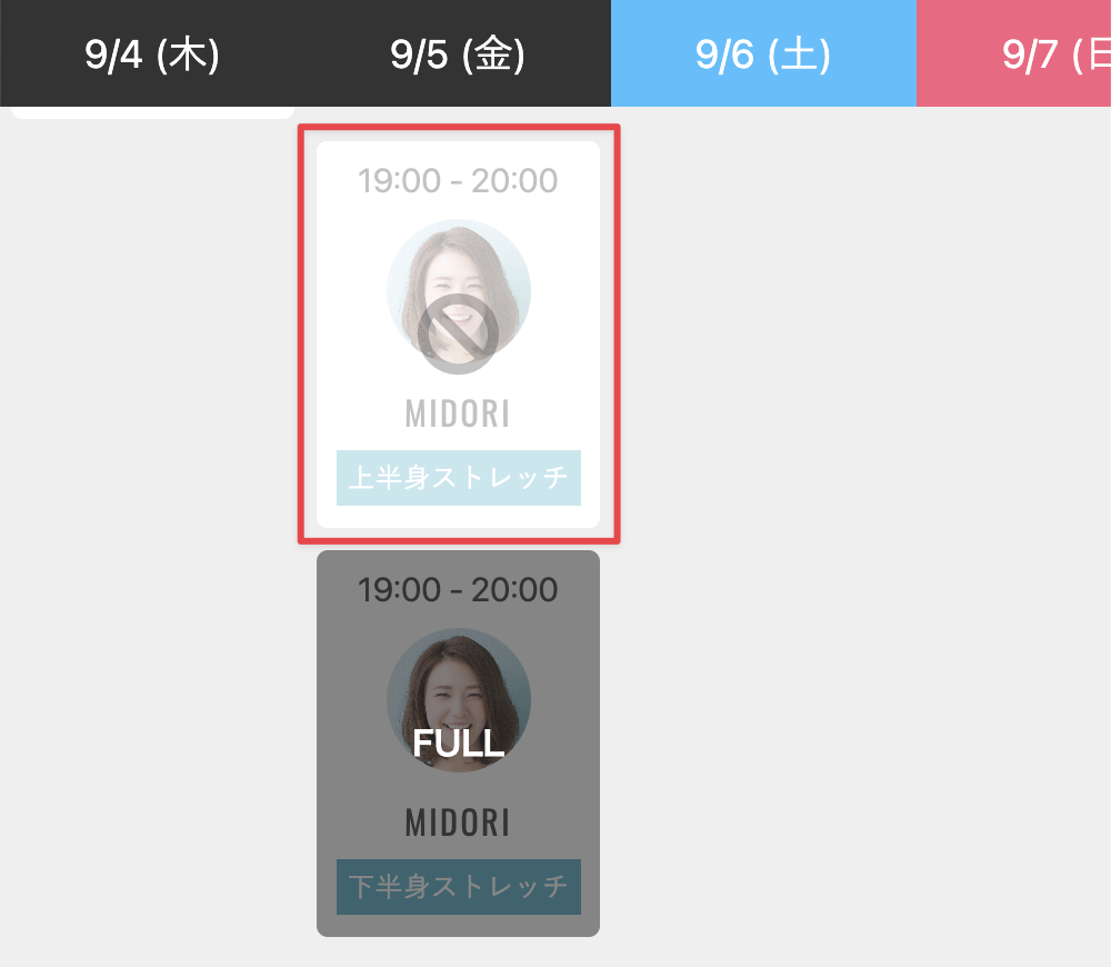 固定枠予約:予約できないことを示すアイコンが表示され予約枠が薄い色で表示されます(例:「下半身ストレッチ」に予約が入っているため「上半身ストレッチ」の予約がブロック)。
