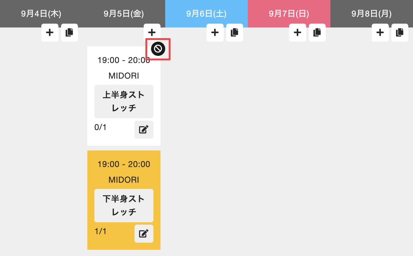 固定枠予約:予約がブロックされていることを示すアイコンが表示されます(例:「下半身ストレッチ」に予約が入っているため「上半身ストレッチ」の予約がブロック)。
