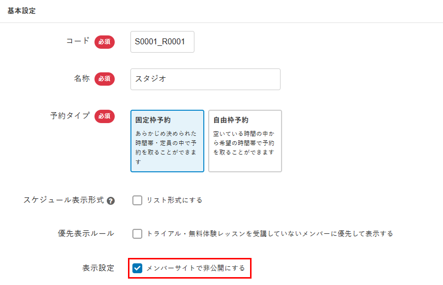 メンバーサイトに公開しない予約カテゴリを設定できます。非公開にした予約カテゴリは、カテゴリ内のすべてのレッスンがメンバーサイト上で非公開となります。各レッスンを個別に非公開設定する必要はありません。