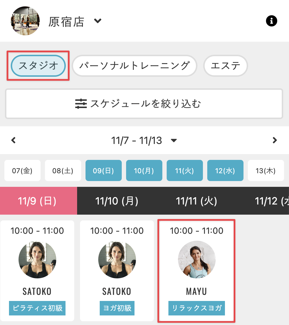 - 予約カテゴリを選択し、予約カレンダーで希望の日時のレッスンをタップします。