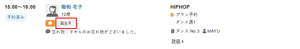 メンバータイプ([誕生日]や[初回のプラン契約からの経過日数]など)を登録しておくと、予約者リストにその情報が表示されます。メンバータイプの設定については、「メンバータイプを登録する」を参照してください。