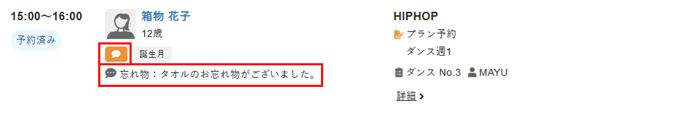申し送りがある場合、吹き出しのアイコンと申し送り内容が表示されます。